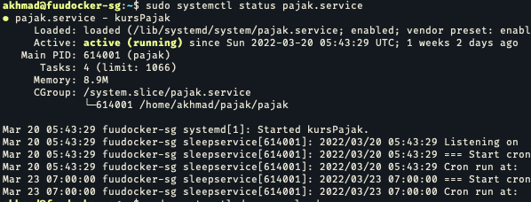 ExecStart, andWorkingDirectoryExecStartshould be point to the executable binary, just like how you usually run the app directly. In my example above, i haveenv HTTP_PORT=":8080"that will be passed to the app as HTTP Port to access the app.WorkingDirectoryhere will be relative path for the app. It’s not depends to the binary file you have, so you can change it anywhere you want. I have set this inside/home/akhmad/pajak/to store a file created from the app, and to read the file from the app.